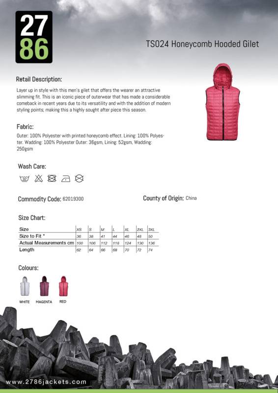 Layer up in style with this men’s gilet that offers the wearer an attractive slimming fit. This is an iconic piece of outerwear that has made a considerable comeback in recent years due to its versatility and with the addition of modern styling points; making this a highly sought after piece this season.Contrast coil zip on centre front with signature zip puller and mouse tail piping on each side of zip openingFront and back square stitched baffles with linear side narrow baffles250gsm lightweight polyester fillFully-lined in tonal polyesterInset welt pocket with concealed zip opening and double zip garagesContrast stretch binding on hem, armholes and hood openingInternal piping around inside facingSecure hood attached to collarInternal welt pocketInternal zipped opening on back panel for embroidery accessProduct contains no branded neck label.* Removable Kimble or looped garment tagsInner seam label holds important product information on one label with a second label containing brand information which can be cut-away.Age Group: AdultFabric: Outer: 100% Polyester with printed honeycomb effect. Lining: 100% Polyester. Wadding: 100% PolyesterGender: MalePlus Size: YesProduct Type: Gilets & Body WarmersSize Exclusions: *3XL not available in these coloursSize Range: XS to 3XLSizing To Fit: XS 36″ S 38″ M 41″ L 44″ XL 46″ 2XL 48″ 3XL* 50″Tag: Cut-away inner labelWashing Instructions: Machine wash 30°. Gentle setting. Do not bleach. Iron low. Do not tumble dry. Do not dry cleanWeight (GSM): Outer: 36gsm, Lining: 52gsm, Wadding: 250gsm]]>