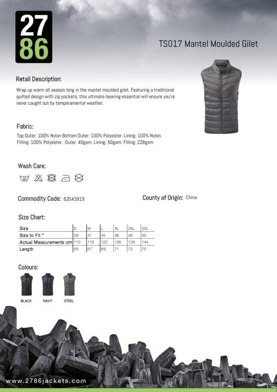 Wrap up warm all season long in the mantel moulded gilet. Featuring a traditional quilted design with zip pockets, this ultimate layering essential will ensure you’re never caught out by temperamental weather.Reverse coil zip on centre front with signature zip puller and internal storm flap and chin guardMoulded baffle panels on front and backDiagonal ‘V’ stitched sandwiched baffles on front and back upper body panels with horizontal stitched baffles at side seams228gsm lightweight polyester fillInternal binding on all seamsPockets to have reverse coil zips with upper zip garages onlyStretch binding around armholes and hem for added protectionProduct contains no branded neck label.* Removable Kimble or looped garment tagsInner seam label holds important product information on one label with a second label containing brand information which can be cut-away.Age Group: AdultFabric: Top outer: 100% Nylon. Bottom outer: 100% Polyester. Lining: 100% Nylon. Filling: 100% PolyesterGender: MalePlus Size: YesProduct Type: Gilets & Body WarmersSize Range: S to 3XLSizing To Fit: S 38″ M 41″ L 44″ XL 46″ 2XL 48″ 3XL 50″Tag: Cut-away inner labelWashing Instructions: Machine wash 30°. Gentle setting. Do not bleach. Iron low. Do not tumble dry. Do not dry cleanWeight (GSM): Outer: 40gsm. Lining: 50gsm. Filling: 228gsm]]>