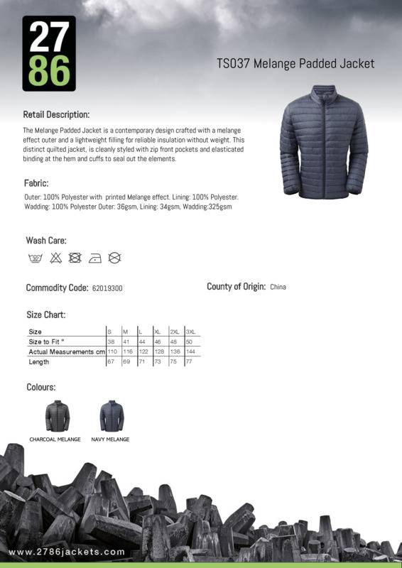 The Melange padded jacket is a contemporary design crafted with a melange effect outer and a lightweight filling for reliable insulation without weight. This distinct quilted jacket, is cleanly styled with zip front pockets and elasticated binding at the hem and cuffs to seal out the elements.Reverse coil zip with signature zip puller and internal storm flap and chin guardConcealed zip pockets with teardrop pullerHorizontal stitched sandwiched baffles325gsm polyester fillStretch binding around hem and cuffs for added protectionSmartphone friendly - internal self loop for headphone wire attachmentBinding around internal seamsProduct contains no branded neck label.* Removable Kimble or looped garment tagsInner seam label holds important product information on one label with a second label containing brand information which can be cut-away.Age Group: AdultFabric: Outer: 100% Polyester with printed melange effect. Lining: 100% Polyester. Wadding: 100% PolyesterGender: MalePlus Size: YesProduct Type: JacketsSize Range: S to 3XLSizing To Fit: S 38″ M 41″ L 44″ XL 46″ 2XL 48″ 3XL 50″Tag: Cut-away inner labelWashing Instructions: Machine wash 30°. Gentle setting. Do not bleach. Iron low. Do not tumble dry. Do not dry cleanWeight (GSM): Outer: 36gsm. Lining: 34gsm. Wadding: 325gsm]]>