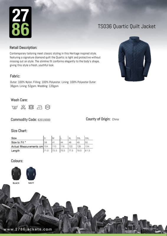Contemporary tailoring meet classic styling in this Heritage inspired style, featuring a signature diamond quilt the Quartic is light and protective without missing out on style. The slimline fit conforms elegantly to the body's shape, giving this style a fresh, youthful look.External central storm flap with internal coil zip, signature zip puller and visible stud fasteningDiamond stitched sandwiched baffles120gsm lightweight polyester fillCentral storm flap with internal zip fasteningInternal signature back neck hanger loopStud opening at cuffsLower body patch pockets with flap and stud fasteningProduct contains no branded neck label.* Removable Kimble or looped garment tagsInner seam label holds important product information on one label with a second label containing brand information which can be cut-away.Age Group: AdultFabric: Outer: 100% Nylon. Filling: 100% Polyester. Lining: 100% PolyesterGender: MalePlus Size: YesProduct Type: JacketsSize Range: S to 3XLSizing To Fit: S 38″ M 41″ L 44″ XL 46″ 2XL 48″ 3XL 50″Tag: Cut-away inner labelWashing Instructions: Machine wash 30°. Gentle setting. Do not bleach. Iron low. Do not tumble dry. Do not dry cleanWeight (GSM): Outer: 36gsm. Lining: 52gsm. Wadding: 120gsm]]>