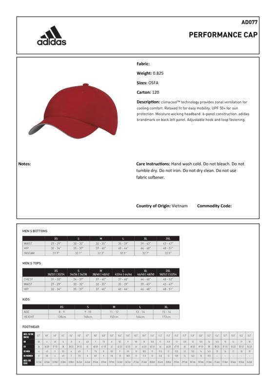 The adidas® Performance Cap is a lightweight item with adjustable hook and loop fastening design offering protection from the sun with moisture wicking.ClimaCool technology provides zonal ventilation for cooling comfortRelaxed fit for easy mobilityUPF 50+ for sun protectionMoisture-wicking headband6-panel constructionadidas® brand mark on back left panelAdjustable hook and loop fastening.Age Group: AdultFabric: 100% PolyesterGender: UnisexPlus Size: NoProduct Type: CapsSize Range: OnesizeSizing To Fit: One sizeTag: Sewn TagWashing Instructions: Hand wash cold. Do not bleach. Do not tumble dry. Do not iron. Do not dry clean. Do not use fabric softener.Weight (GSM): 91gsm]]>