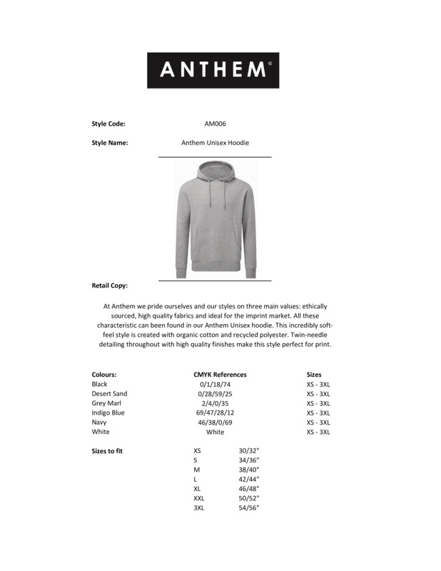 Lighten up with the Anthem unisex hoodie. This re-imagined Anthem hoodie design features a lightweight hood and skinny drawcords with matching eyelets and ends. Plain perfection, or ready for decoration. Because details matter.Certified organic yarn and factoryCertified recycled yarn and factorySoft hand feelDouble-fabric hoodBrushed inner fleeceNickel-free, colour-matched eyelets and drawcord endsTwin-needle detailCut and sew 1x1 ribbed cuffs and hemKangaroo pocketSelf-coloured neck size labelCertified SEDEX, AMFORI, PETA APPROVED VEGAN, OKEO-TEX®.Accreditations: SEDEX|Amfori BSCI|Certified Recycled|Certified Organic|Oeko-Tex Standard 100|Peta Approved VeganAge Group: AdultFabric: Solid colours: 80% Orangic cotton, 20% Recycled polyester. Grey Marl: 73% Organic cotton, 21% Recycled polyester, 6% ViscoseGender: UnisexPlus Size: YesProduct Type: HoodiesSize Range: XS – 3XLSizing To Fit: XS 30/32″ S 34/36″ M 38/40″ L 42/44″ XL 46/48″ 2XL 50/52″ 3XL 54/56″Tag: TaglessWashing Instructions: Machine wash 30°. Do not bleach. Iron low. Do not tumble dry. Dry clean.Weight (GSM): 240gsm]]>