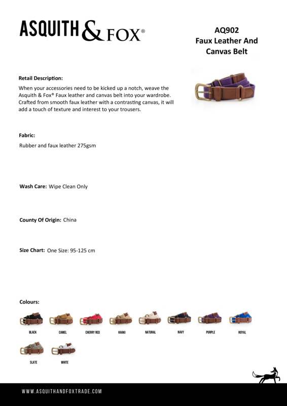 When your accessories need to be kicked up a notch, weave the Asquith & Fox® Faux leather and canvas belt into your wardrobe. Crafted from smooth faux leather with a contrasting canvas, it will add a touch of texture and interest to your trousers.Canvas and faux leather beltBelt strap and buckle are faux leather3 holes for belt buckleAdjustable lengthProduct contains no branded neck labelRemovable Kimble or looped garment tagsInner seam label holds important product information on one label with a second label containing brand information which can be cut-awayPlease note old stock may contain a fixed branded label.Accreditations: Amfori BSCIAge Group: AdultFabric: Canvas and faux leatherGender: UnisexPlus Size: NoProduct Type: BeltsSize Range: OneSizeSizing To Fit: One size (95/125cm)Tag: Cut-away inner labelWashing Instructions: Wipe clean onlyWeight (GSM): 275gsm]]>