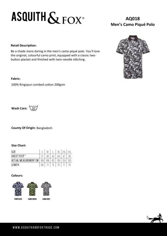 Be a shade more daring in the men's camo piqué polo. You'll love the original, colourful camo print, equipped with a classic two-button placket and finished with twin-needle stitching.Classic fit polo with Camo print designRibbed knit collar and sleeve cuffsTwin needle stitching on hemTwo self coloured buttons on placketProduct contains no branded neck labelRemovable Kimble or looped garment tagsInner seam label holds important product information on one label with a second label containing brand information which can be cut-awayPlease note old stock may contain a fixed branded labelAccreditations: Amfori BSCIAge Group: AdultFabric: 100% Ringspun combed cottonGender: MaleProduct Type: PolosSize Range: S to 3XLSizing To Fit: S 37″ M 40″ L 42″ XL 44″ 2XL 47″ 3XL 49″Tag: Cut-away inner labelWashing Instructions: Domestic wash at 30cWeight (GSM): 200gsm]]>