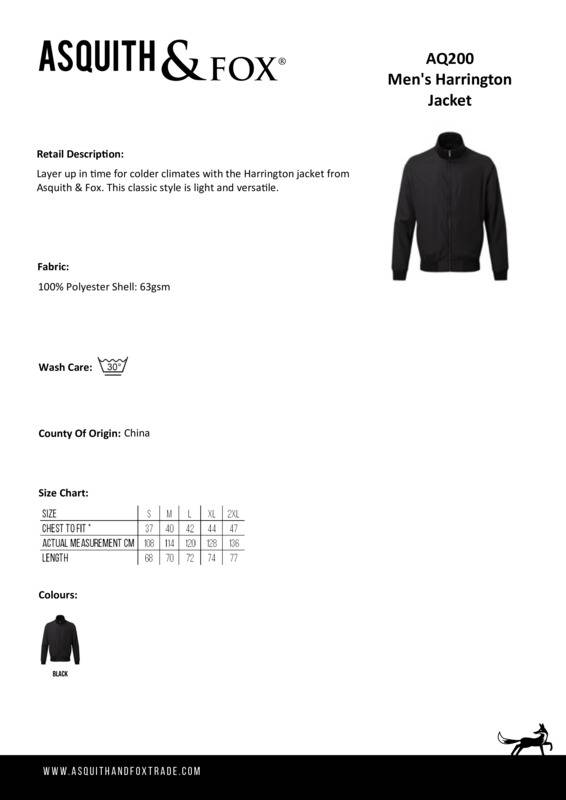 Layer up in time for colder climates with the Harrington jacket from Asquith & Fox®. This classic style is light and versatile.Classic fit Harrington style jacketElasticated ribbed knit collar, cuffs and hemFinishes just beneath the waistlineFull-zip through styleTwo side slit pocketsEmbroidery access on the lower back and left hand side of chestProduct contains no branded neck labelRemovable Kimble or looped garment tagsInner seam label holds important product information on one label with a second label containing brand information which can be cut-awayPlease note old stock may contain a fixed branded label.Accreditations: Amfori BSCIAge Group: AdultFabric: 100% PolyesterGender: MalePlus Size: NoProduct Type: JacketsSize Range: S to 2XLSizing To Fit: S 37″ M 40″ L 42″ XL 44″ 2XL 47″Tag: Cut-away inner labelWashing Instructions: Domestic wash at 30cWeight (GSM): Shell: 63gsm]]>