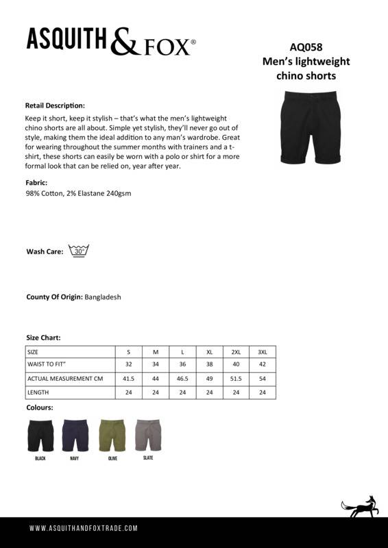 Keep it short, keep it stylish – that’s what the men’s lightweight chino shorts are all about. Simple yet stylish, they’ll never go out of style, making them the ideal addition to any man’s wardrobe. Great for wearing throughout the summer months with trainers and a t-shirt, these shorts can easily be worn with a polo or shirt for a more formal look that can be relied on, year after year.Men’s chino shorts with two swing pockets and two back jet pocketsZip fly and button fastening to the frontSoft-finish lightweight fabricBelt loopsStyle can be worn rolled upProduct contains no branded neck labelRemovable Kimble or looped garment tagsInner seam label holds important product information on one label with a second label containing brand information which can be cut-awayPlease note old stock may contain a fixed branded label.Accreditations: SEDEX|Amfori BSCIAge Group: AdultFabric: 98% Cotton, 2% ElastaneGender: MalePlus Size: YesProduct Type: ShortsSize Range: S – 3XLSizing To Fit: S 32″ M 34″ L 36″ XL 38″ 2XL 40″ 3XL 42″Tag: Cut-away inner labelWashing Instructions: Machine wash 30°C. Line dry. Wash with similar colours. Do not bleach. Medium Iron. Do not tumble dry. Do not dry clean. Wash inside out.Weight (GSM): 240gsm]]>