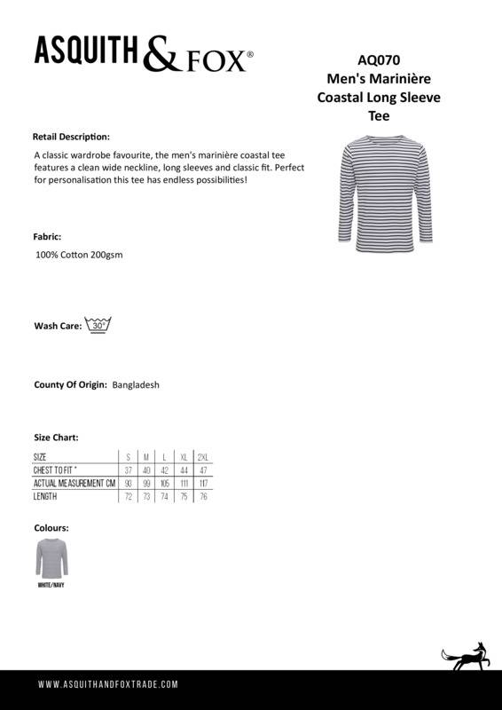 With its roots in French nautical uniforms, the classic marinière top has been around for over 150 years. The Asquith & Fox® marinière coastal tee retains the classic style and spirit of the traditional top with a fashionable spin. The men's marinière coastal tee features a clean wide neckline, long sleeves and classic fit. Perfect for personalisation this tee has endless possibilities!Soft feel fabricCrew neckLong sleevesDouble stitched arm holes and hemClassic fitProduct contains no branded neck labelRemovable Kimble or looped garment tagsInner seam label holds important product information on one label with a second label containing brand information which can be cut-awayPlease note old stock may contain a fixed branded label.Accreditations: SEDEX|Amfori BSCIAge Group: AdultFabric: 100% CottonGender: MalePlus Size: NoProduct Type: T-ShirtsSize Range: S to 2XLSizing To Fit: S 37″ M 40″ L 42″ XL 44″ 2XL 47″Tag: Cut-away inner labelWashing Instructions: Domestic wash at 30cWeight (GSM): 200gsm]]>
