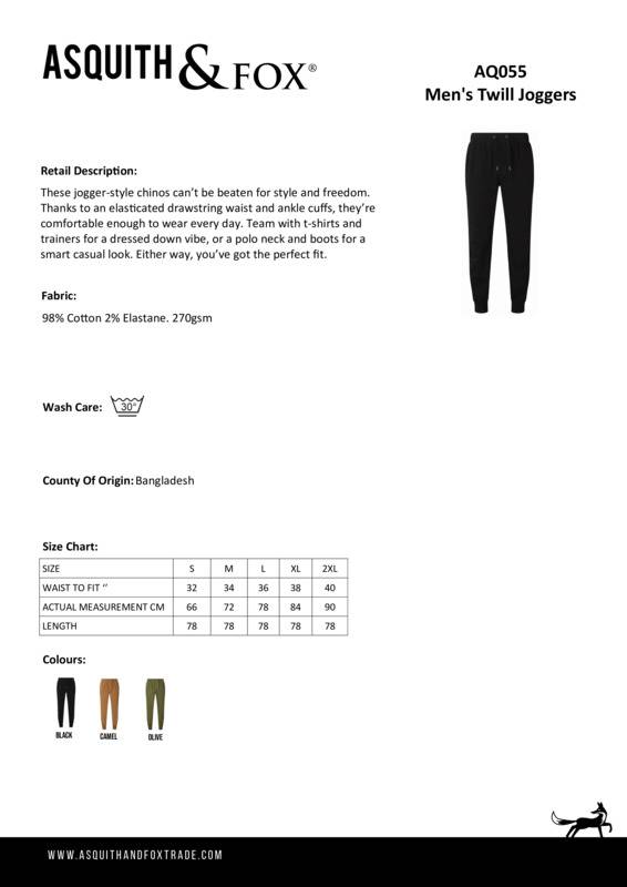 These jogger style chinos can’t be beaten for style and freedom. Thanks to an elasticated drawstring waist and ankle cuffs, they’re comfortable enough to wear every day. Team with t-shirts and trainers for a dressed down vibe, or a polo neck and boots for a smart casual look. Either way, you’ve got the perfect fit.Jogger style chino trousersElasticated at waist an anklesTwo front seamed pocketsBack jetted pocketsDrawcord to waistProduct contains no branded neck labelRemovable Kimble or looped garment tagsInner seam label holds important product information on one label with a second label containing brand information which can be cut-awayPlease note old stock may contain a fixed branded label.Accreditations: SEDEX|Amfori BSCIAge Group: AdultFabric: 98% Cotton, 2% ElastaneGender: MalePlus Size: NoProduct Type: SweatpantsSize Range: S to 2XLSizing To Fit: S 32″ M 34″ L 36″ XL 38″ 2XL 40″Tag: Cut-away inner labelWashing Instructions: Domestic wash at 30cWeight (GSM): 270gsm]]>