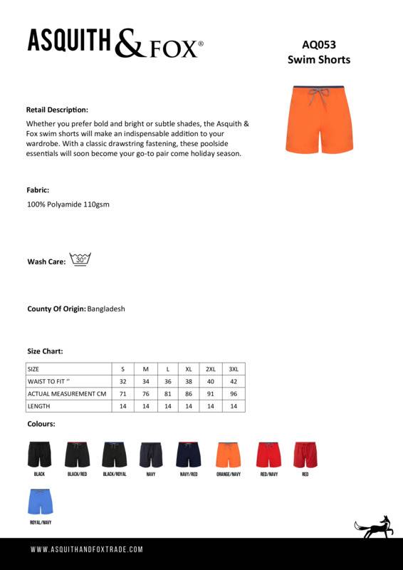 Whether you prefer bold and bright or subtle shades, the Asquith & Fox® swim shorts will make an indispensable addition to your wardrobe. With a classic drawstring fastening, these poolside essentials will soon become your go-to pair come holiday season.Contrast colour on waist bandContrasting inner waist band colourTie waistTwo eyeletsStriped tie cordElasticated waistMesh inner liningTwo side pockets with mesh inner liningSingle hook and loop fastening pocket on the backProduct contains no branded neck labelRemovable Kimble or looped garment tagsInner seam label holds important product information on one label with a second label containing brand information which can be cut-awayPlease note old stock may contain a fixed branded label.Accreditations: WRAP|Amfori BSCIAge Group: AdultFabric: 100% PolyamideGender: MalePlus Size: YesProduct Type: ShortsSize Range: S to 3XLSizing To Fit: S 32″ M 34″ L 36″ XL 38″ 2XL 40″ 3XL 42″Tag: Cut-away inner labelWashing Instructions: Domestic wash at 30cWeight (GSM): 110gsm]]>