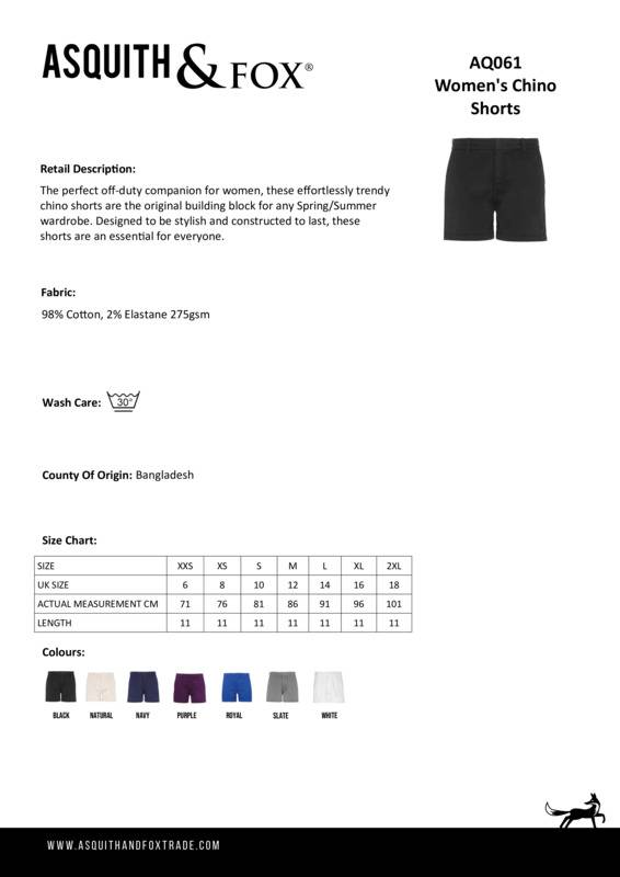 The perfect off-duty companion for women, these effortlessly trendy chino shorts are the original building block for any Spring/Summer wardrobe. Designed to be stylish and constructed to last, these shorts are an essential for everyone.Women's classic fit shorts in a soft fabric finishZip fly with button fastening at waistBelt loopsTwo swing pockets to the side and back jetted pockets with button fasteningProduct contains no branded neck labelRemovable Kimble or looped garment tagsInner seam label holds important product information on one label with a second label containing brand information which can be cut-awayPlease note old stock may contain a fixed branded label.Accreditations: Amfori BSCIAge Group: AdultFabric: 98% Cotton, 2% ElastaneGender: FemalePlus Size: NoProduct Type: ShortsSize Range: XXS to 2XLSizing To Fit: XXS 6(22″) XS 8(24″) S 10(26″) M 12(28″) L 14(30″) XL 16(32″) 2XL 18(34″)Tag: Cut-away inner labelWashing Instructions: Domestic wash at 30cWeight (GSM): 275gsm]]>