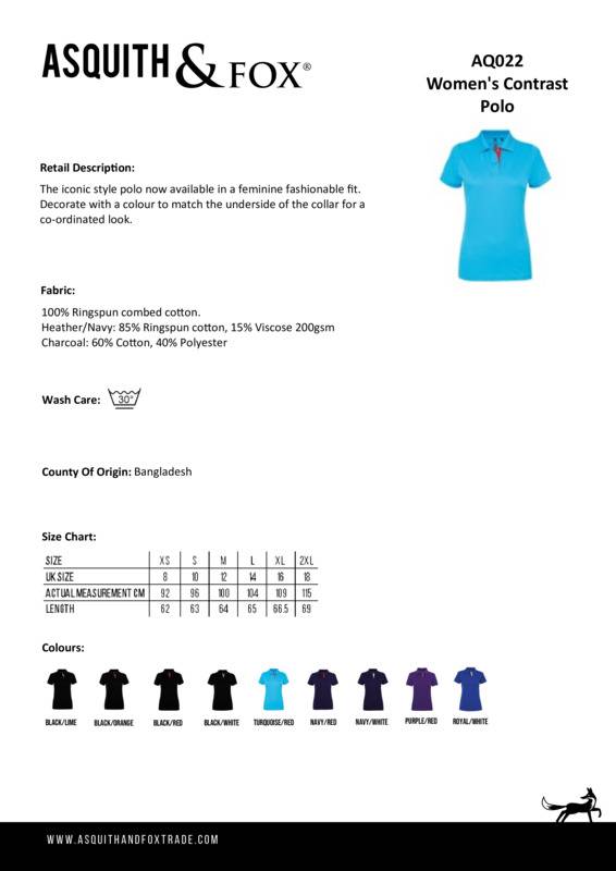 The iconic style polo now available in a feminine fashionable fit. Decorate with a colour to match the underside of the collar for a co-ordinated look.Fitted polo for women with contrast collar and placketTwo contrast coloured buttons on placketContrast colour on side ventsTwin needle stitching on hemRibbed knit collar and sleeve cuffsProduct contains no branded neck labelRemovable Kimble or looped garment tagsInner seam label holds important product information on one label with a second label containing brand information which can be cut-awayPlease note old stock may contain a fixed branded label.Accreditations: Amfori BSCIAge Group: AdultFabric: 100% Ringspun combed cotton. Heather/Navy: 85% Ringspun cotton, 15% Viscose. Charcoal: 60% Cotton, 40% PolyesterGender: FemalePlus Size: NoProduct Type: PolosSize Range: XS to 2XLSizing To Fit: XS 8(33″) S 10(35″) M 12(37″) L 14(39″) XL 16(41″) 2XL 18(43″)Tag: Cut-away inner labelWashing Instructions: Domestic wash at 30cWeight (GSM): 200gsm]]>