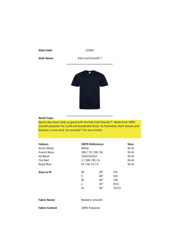 Sports day never looked so good! The Kids cool smooth T is bright and bold with a relaxed fit to help you beat the rest. This lightweight, smooth Neoteric™ t-shirt features a classic crew neck and relaxed fit, perfect for keeping cool and comfortable at after school sports club.Classic crew neck T in relaxed kids fitFeaturing high performance wicking fabric, crew neck and smooth fabric faceWRAP certifiedVegan certifiedBSCI certifiedOeko-Tex certifiedSEDEX certified.Accreditations: Amfori BSCI|Oeko-Tex|Sedex|WRAP|Peta Approved VeganAge Group: KidsFabric: 100% PolyesterGender: UnisexPlus Size: NoProduct Type: T-ShirtsSize Range: 3/4 to 12/13Sizing To Fit: XS 3/4 S 5/6 M 7/8 L 9/11 XL 12/13Tag: Tear-outWashing Instructions: Machine wash 30°. Do not bleach. Do not iron. Do not tumble dry. Do not dry clean.Weight (GSM): 135gsm]]>