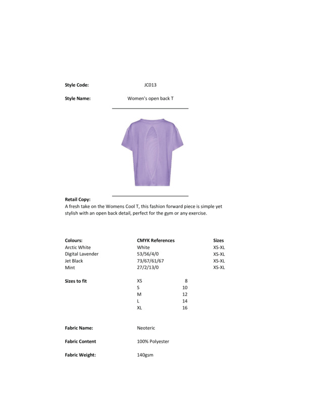 A fresh take on the women’s Cool T, this fashion-forward piece is simple yet stylish, with an open back detail – perfect for the gym or any exercise.AWDis’ own lightweight Neoteric™ textured fabric with inherent wickabilityRelaxed fitOpen back design featureSet-in sleeve designSelf-fabric crew neckSelf-fabric taped back neckTwin-needle stitching detailSimple tear-off label makes it perfect for rebrandingUPF 30+ UV protectionCertified Peta Approved Vegan, WRAP, SEDEX, OKEO-TEX® and BSCI.Accreditations: Sedex|WRAP|Peta Approved Vegan|Oeko-Tex|Amfori BSCIAge Group: AdultFabric: 100% PolyesterGender: FemalePlus Size: NoProduct Type: T-ShirtsSize Range: XS – XLSizing To Fit: XS 8 S 10 M 12 L 14 XL 16Tag: Tear-awayWashing Instructions: Machine wash 30°. Do not bleach. Do not iron. Do not tumble dry. Do not dry clean.Weight (GSM): 140gsm]]>