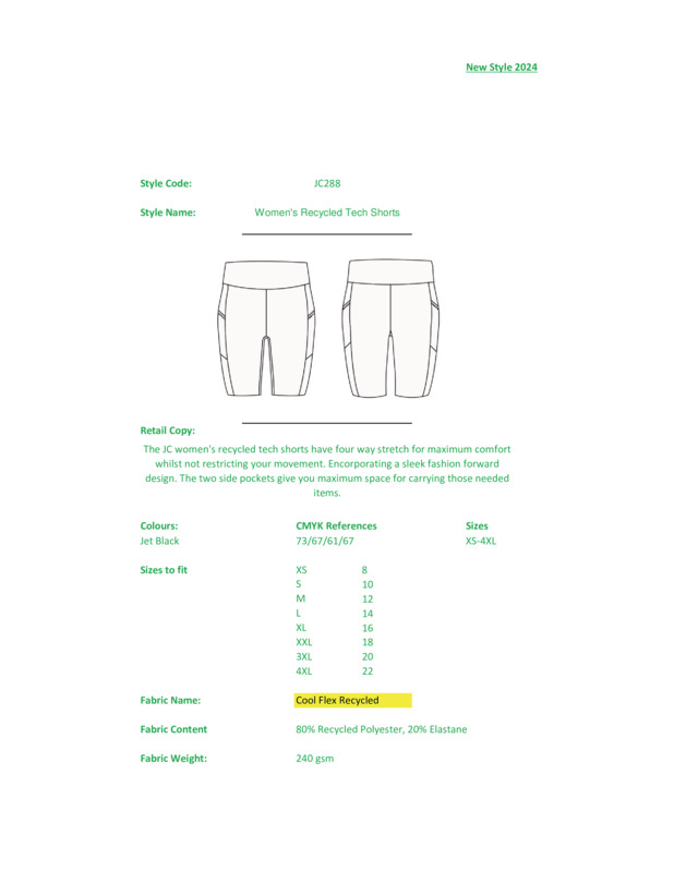 The Just Cool women’s recycled tech shorts have four-way stretch fabric for maximum comfort yet don’t restrict your movement. They incorporate a sleek, fashion-forward design, while the two side pockets offer maximum space for carrying necessary items.Slim fitFour-way stretch fabricTwo side pocketsErgonomic fitMade with recycled polyesterTear-away labelPETA and SMETA certified.Accreditations: Peta Approved VeganAge Group: AdultFabric: 80% Recycled polyester, 20% ElastaneGender: FemalePlus Size: YesProduct Type: ShortsSize Range: XS–4XLSizing To Fit: XS 8 S 10 M 12 L 14 XL 16 2XL 18 3XL 20 4XL 22Tag: Tear-awayWashing Instructions: Wash at 30 degrees or below. Do not bleach. Do not tumble dry. Do not dry clean. Do not iron.Weight (GSM): 240gsm]]>