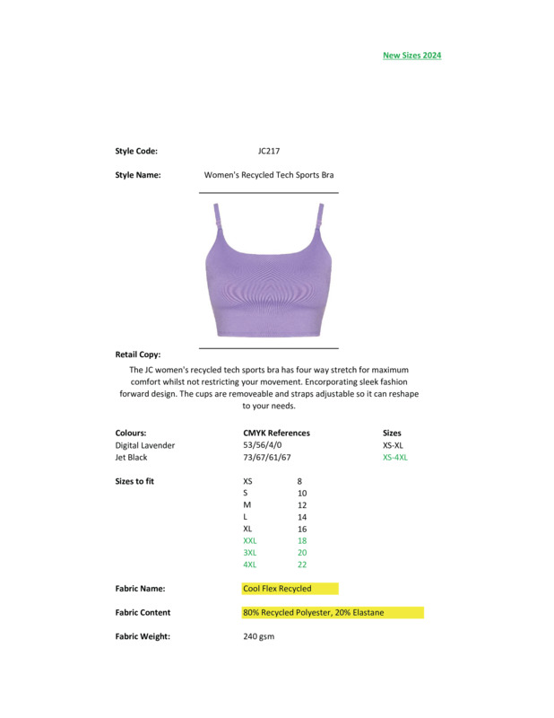The women’s recycled tech sports bra has four-way stretch for maximum comfort whilst not restricting movement. Incorporates sleek, fashion-forward design. The cups are removable and the straps adjustable, so it can reshape to your needs.Four-way stretch for maximum movementRemovable padded bust cupsAdjustable strapsInternal supportMade with recycled polyester, saving resources and decreasing emissionsCertified Peta Approved Vegan, WRAP, SEDEX, OKEO-TEX® and BSCI.Accreditations: Sedex|WRAP|Peta Approved Vegan|Oeko-Tex|Amfori BSCIAge Group: AdultFabric: 86% Recycled polyester, 14% ElastaneGender: FemalePlus Size: NoProduct Type: BrasSize Exclusions: *2XL, 3XL and 4XL only available in these coloursSize Range: XS – 4XLSizing To Fit: XS 8 S 10 M 12 L 14 XL 16 2XL* 18 3XL* 20 4XL* 22Tag: Tear-awayWashing Instructions: Machine wash 30°. Do not bleach. Do not iron. Do not tumble dry. Do not dry clean.Weight (GSM): 240gsm]]>