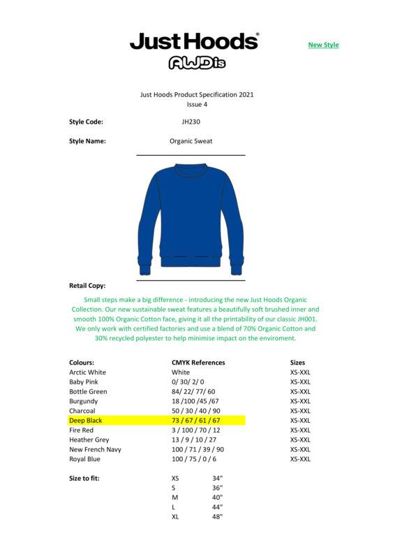 Small steps make a big difference - this sustainable sweatshirt features a beautifully soft-brushed inner and smooth 100% organic cotton face, giving it all the printability of the classic JH001. Sourced from certified factories with a blend of 80% organic cotton and 20% recycled polyester to help minimise impact on the environment.GRS Certified yarn and factoryCrew neck sweatshirtSet-in sleevesTaped neckStylish fitBrushed inner fleeceSimple tear-out label makes it perfect for rebrandingTwin-needle stitchingRibbed collar, cuffs and hemSoft-cotton faced fabric creates ideal printing surfaceSedex certifiedVegan certifiedWRAP certified.Accreditations: WRAP|Sedex|Peta Approved VeganAge Group: AdultFabric: 80% Organic cotton, 20% Recycled polyester. Heather Grey: 75% Organic cotton, 25% Recycled polyesterGender: MalePlus Size: NoProduct Type: SweatshirtsSize Range: XS to 2XLSizing To Fit: XS 34″ S 36″ M 40″ L 44″ XL 48″ 2XL 52″Tag: Tear-outWashing Instructions: Machine wash 30°. Do not bleach. Iron low heat. Tumble dry low heat. Do not dry clean.Weight (GSM): 280gsm]]>