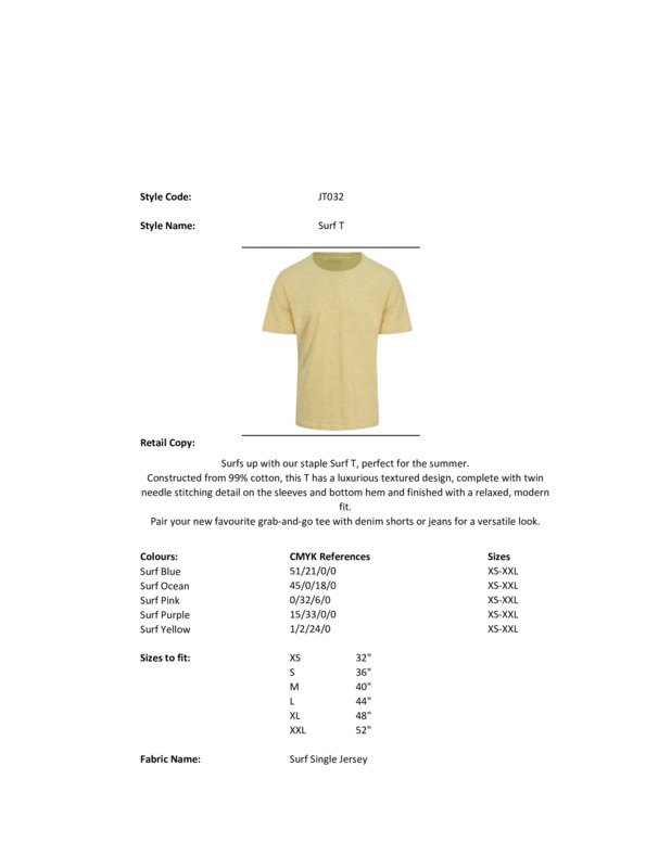 Surfs up with our Surf T, perfect for the summer. Constructed from 99% cotton, this T has a luxurious textured design, complete with twin needle stitching detail on the sleeves and bottom hem and finished with a relaxed, modern fit. Pair your new favourite grab-and-go tee with denim shorts or jeans for a versatile look.Modern fitShort sleevesRibbed crew neck style with taped back neckTwin-needle stitching detail on sleeve and bottom hemWRAP certifiedSEDEX certifiedVegan certified.Accreditations: WRAP|Sedex|Peta Approved VeganAge Group: AdultFabric: 99% Cotton, 1% PolyesterGender: MalePlus Size: NoProduct Type: T-ShirtsSize Range: XS to 2XLSizing To Fit: XS 32″ S 36″ M 40″ L 44″ XL 48″ 2XL 52″Tag: TaglessWashing Instructions: Machine wash 30 degrees. Do not bleach. Iron low. Tumble dry low. Do not dry clean. Wash dark colours separately.Weight (GSM): 160gsm]]>