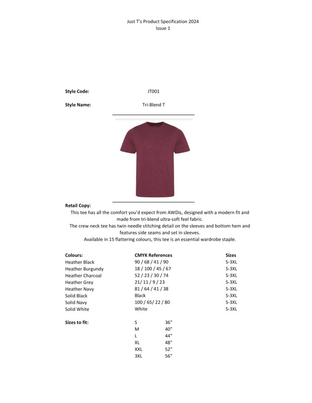 This tee has all the comfort you'd expect from AWDis, designed with a modern fit and made from triblend ultra-soft feel fabric. The crew neck tee has twin needle stitching detail on the sleeves and bottom hem and features side seams and set in sleeves. Available in a variety flattering colours, this tee is an essential wardrobe staple.Modern fit short sleeved TSize tab labelTriblend fabric for style and comfortTaped neckTwin-needle stitching on sleeves and bottom hemRibbed crew neck stylesoft-feel fabricSide seamsSet-in sleevesWorldwide Responsible Accredited Production (WRAP) certified productionWRAP certifiedVegan certifiedSEDEX certified.Accreditations: WRAP|Sedex|Peta Approved VeganAge Group: AdultFabric: 50% Polyester, 25% Viscose, 25% Cotton. Heather Black: 40% Viscose, 40% Cotton, 20% PolyesterGender: MalePlus Size: YesProduct Type: T-ShirtsSize Range: S to 3XLSizing To Fit: S 36″ M 40″ L 44″ XL 48″ 2XL 52″ 3XL 56″Tag: TaglessWashing Instructions: Machine wash 30°. Do not bleach. Tumble dry possible at low heat. Cool Iron. Do not dry clean. Wash dark colour separately.Weight (GSM): 160gsm]]>