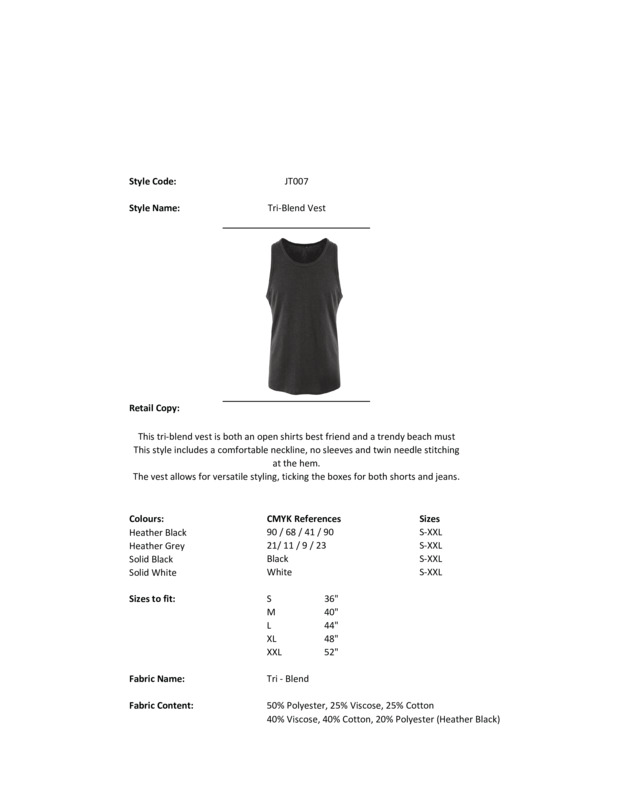 This triblend vest is both an open shirts best friend and a trendy beach must have. The brand new styles includes a comfortable neckline, no sleeves and twin needle stitching at the hem. The vest allows for versatile styling, ticking the boxes for both shorts and jeans.Modern fit vest styleScoop neckSelf binding around neckline and armholeTwin-needle stitching detail on hemWRAP certifiedSEDEX certifiedVegan certified.Accreditations: WRAP|Sedex|Peta Approved VeganAge Group: AdultFabric: 50% Polyester, 25% Viscose, 25% Cotton. Heather Black: 40% Viscose, 40% Cotton, 20% PolyesterGender: MalePlus Size: NoProduct Type: VestsSize Range: S to 2XLSizing To Fit: S 36″ M 40″ L 44″ XL 48″ 2XL 52″Tag: TaglessWashing Instructions: Machine wash 30 degrees. Do not bleach. Iron low. Tumble dry low. Do not dry clean. Wash dark colours separately.Weight (GSM): 160gsm]]>