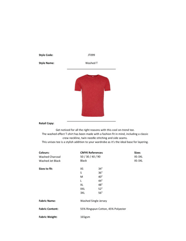 Get noticed for all the right reasons with this cool on-trend tee. The washed effect T-shirt has been made with a fashion fit in mind, including a classic crew neckline, twin needle stitching and side seams. This unisex tee is a stylish addition to your wardrobe as it's the ideal base for layering.Modern and stylish fitShort sleeved TSize tab labelWashed effect, soft touchTaped neckTwin-needle stitching on sleeves and bottom hemRibbed crew neck style1x1 rib knit collarSet-in sleevesStylish fitDue to washing process each garment is uniqueWorldwide Responsible Accredited Production (WRAP) certified productionWRAP certifiedVegan certifiedSEDEX certified.Accreditations: WRAP|Sedex|Peta Approved VeganAge Group: AdultFabric: 55% Cotton, 45% PolyesterGender: MalePlus Size: YesProduct Type: T-ShirtsSize Range: XS to 3XLSizing To Fit: XS 34″ S 36″ M 40″ L 44″ XL 48″ 2XL 52″ 3XL 56″Tag: TaglessWashing Instructions: Machine wash 30°. Do not bleach. Tumble dry possible at low heat. Cool Iron. Do not dry clean. Wash dark colour separatelyWeight (GSM): 165gsm]]>