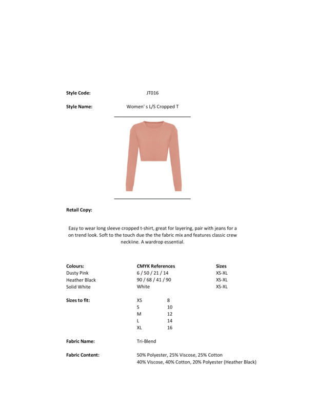 Easy-to-wear long sleeve cropped t-shirt, great for layering. Pair with jeans for an on-trend look. Soft to the touch, due to its fabric mix, and featuring a classic crew neckline. A wardrobe essential.Cropped women’s fit with side seamsLong sleeves with cuffsSize label only, for easy rebranding – colour-coded white for womenTriblend fabric for style and comfortSurface excellent for print or embroideryRibbed crew neck style, with taped neckTwin-needle stitching detail on sleeve and bottom hemVegan certifiedWRAP certifiedSEDEX certifiedOeko-Tex certified.Accreditations: Peta Approved Vegan|WRAP|Sedex|Oeko-TexAge Group: AdultFabric: Triblend 50% Polyester, 25% Viscose, 25% Cotton. Heather Black: 40% Viscose, 40% Cotton, 20% PolyesterGender: FemalePlus Size: NoProduct Type: T-ShirtsSize Range: XS to XLSizing To Fit: XS 8 S 10 M 12 L 14 XL 16Tag: TaglessWashing Instructions: Machine wash 30°. Do not bleach. Iron low. Tumble dry low. Do not dry clean.Weight (GSM): 160gsm]]>