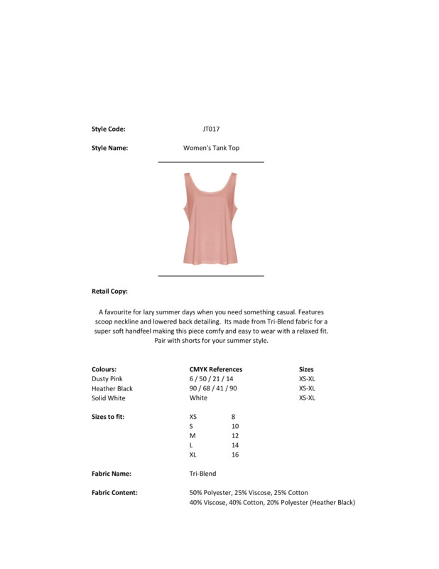 A favourite for lazy summer days, when you need something casual. Features scoop neckline and lowered back detailing. Made from triblend fabric for a super-soft hand feel, it’s comfy and easy to wear with a relaxed fit. Pair with shorts for summer style.Relaxed fitSide seams (non-tubular)Size label only, for easy rebranding – colour coded white for womenTriblend fabric for style and comfortSurface excellent for print or embroiderySelf-fabric binding around neckline and armholeTwin-needle stitching detail on sleeve and bottom hem.Accreditations: WRAP|Sedex|Peta Approved VeganAge Group: AdultFabric: 50% Polyester, 25% Viscose, 25% Cotton. Heather Black: 20% Polyester, 40% Viscose, 40% CottonGender: FemalePlus Size: NoProduct Type: VestsSize Range: XS – XLSizing To Fit: XS 8 S 10 M 12 L 14 XL 16Tag: TaglessWashing Instructions: Machine wash 30°. Do not bleach. Iron low. Low tumble dry. Do not dry clean.Weight (GSM): 160gsm]]>