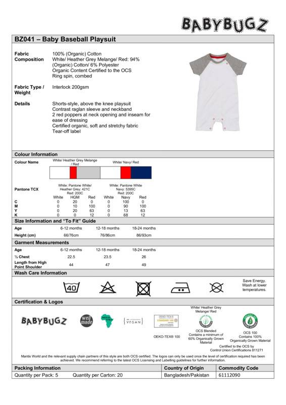 Made from soft organic cotton, this baseball style playsuit features fashionable red contrast poppers along the neck and crotch opening. The short legs give lots of room to wriggle and make your little one ready for any adventure.Contrast red poppers at neck and leg openingShort leg lengthOrganic soft and stretchy fabricComfort side seamsRed taping along inside back neckTear-off labelOeko-Tex certifiedOrganic 100 Content Standard certified.Accreditations: Oeko-Tex|Organic 100 Content Standard|Organic Content Blended Standard|Peta Approved Vegan|GOTSAge Group: InfantFabric: 100% Organic cotton. White/Heather Grey Melange/Red: 94% Organic cotton, 6% Polyester, interlockGender: UnisexPlus Size: NoProduct Type: BodysuitsSize Range: 3/6mths to 12/18mthsSizing To Fit: 3/6mths 60/66cm 6/12mths 66/76cm 12/18mths 76/86cmTag: Tear-outWashing Instructions: 40 degree wash. Do not bleach. Do not tumble dry. Do not dry clean. Warm iron.Weight (GSM): 200gsm]]>