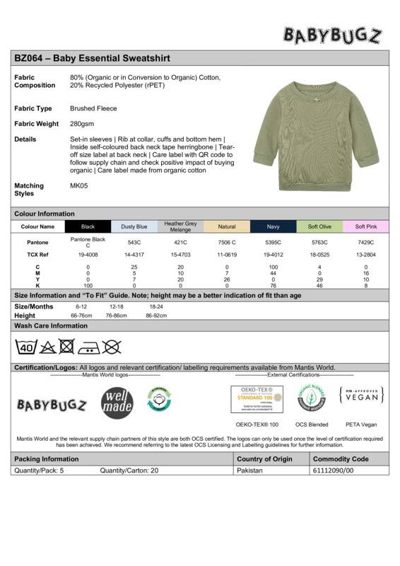 Brush-back fleece offers a comfy choice for babies. Made with a blend of organic (or in conversion) cotton and rPET, this sweat has plenty of space for decoration.Set-in sleevesRib at collar, cuffs and bottom hemInside self-coloured back neck tape herringboneTear-off size label at back neckCare label with QR code to follow supply chain and check positive impact of buying organicCare label made from organic cottonOeko-Tex certifiedVegan certifiedGOTS certified.Accreditations: Oeko-Tex|Organic 1 Content Standard|Peta Approved Vegan|GOTSAge Group: InfantFabric: 80% (Organic or in conversion to organic) Cotton, 20% Recycled polyester (rPET)Gender: UnisexPlus Size: NoProduct Type: SweatshirtsSize Range: 6/12 to 18/24Sizing To Fit: 6/12mths 66/76cm 12/18mths 76/86cm 18/24mths 86/93cmTag: Tear-outWashing Instructions: Machine wash 40°. Do not bleach. Iron low. Do not tumble dry. Do not dry clean.Weight (GSM): 280gsm]]>