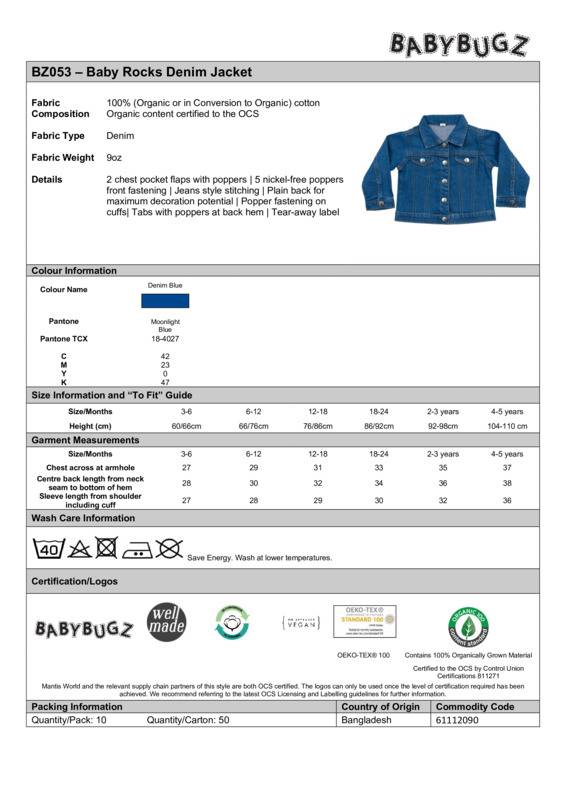 Baby denim jacket in organic cotton designed especially for decoration. Featuring front pocket flaps and mock-panel stitch detail, and 5-silver coloured poppers down placket. Waistband tabs on rear, poppers at cuffs and jeans-style, orange stitching for added authenticity and Tear-out label.5-silver coloured poppers at frontPocket flaps with poppersOrange, jeans-style stitch detailing at front and throughout garmentLong sleeve with cuffs and poppersBack panel free from seaming for optimum decoration potentialTabs with poppers detail on back hemOrganic cotton denim fabricTear-out labelBSCI certifiedOeko-Tex certified.Accreditations: Oeko-Tex|Organic 100 Content Standard|Peta Approved Vegan|GOTSAge Group: InfantFabric: 100% Organic cotton denimGender: UnisexPlus Size: NoProduct Type: JacketsSize Range: 3/6mths to 4/5yrsSizing To Fit: 3/6mths 60/66cm 6/12mths 66/76cm 12/18mths 76/86cm 18/24mths 86/93cm 2/3yrs 93/98cm 4/5yrs 98/106cmTag: Tear-outWashing Instructions: 40 degree wash. Do not bleach. Do not tumble dry. Do not dry clean. Warm iron.Weight (GSM): 9oz]]>