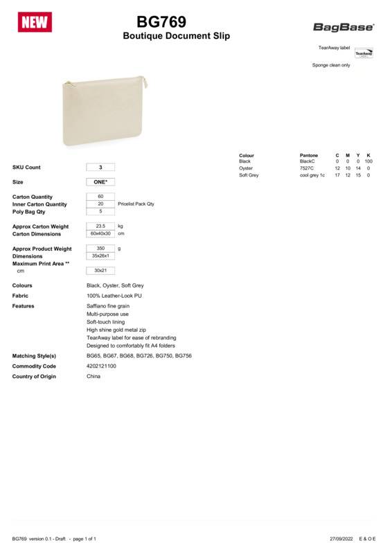 Every product in our Boutique collection combines soft, fine grain Saffiano fabric and high-shine hardware for a premium finish that elevates personalisation and gifting. BG769’s flat, compact design is not only easy to store documents and carry, but also provides generous space for decoration, making it a versatile and elegant promotional piece.100% Leather-look PUSaffiano fine grainMultipurpose useSoft-touch liningHigh-shine gold metal zipTearAway label for eay rebrandingDesigned to comfortably fit A4 folders.Age Group: AdultBag Dimensions: 35 x 26 x 1cmFabric: 100% Leather-look PUGender: UnisexPlus Size: NoProduct Type: BagsSize Range: One sizeSizing To Fit: One sizeTag: Tear-awayWashing Instructions: Sponge clean onlyWeight (GSM): 350g]]>