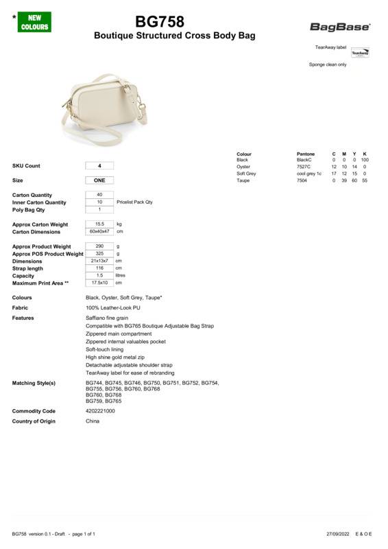 Saffiano, fine grain 100% leather look gives this stylish cross body bag a luxurious finish, complimented by a soft-touch lining and high-shine gold metal zip details. This boxy, structured bag is the perfect design for casual and evening styling, a truly versatile wardrobe staple. Designed in conjunction with the interchangeable BG765 Boutique Adjustable Bag Strap, making for the perfect pairing for any outfit of choice.Saffiano fine grainZipped main compartmentZipped internal valuables pocketSoft-touch liningHigh-shine gold metal zipCompatible with BG765 Boutique adjustable bag strapDetachable, adjustable shoulder strapTearAway label for ease of rebrandingBSCI certifiedReach certified.Accreditations: Amfori BSCI|ReachAge Group: AdultBag Capacity: 1.5 LitresBag Dimensions: 21 x 13 x 7cmFabric: 100% Leather-look PUGender: UnisexPlus Size: NoPrint Area: 17.5 x 10cmProduct Type: BagsSize Range: One sizeSizing To Fit: One sizeTag: Tear-awayWashing Instructions: Sponge clean onlyWeight (GSM): 295g]]>