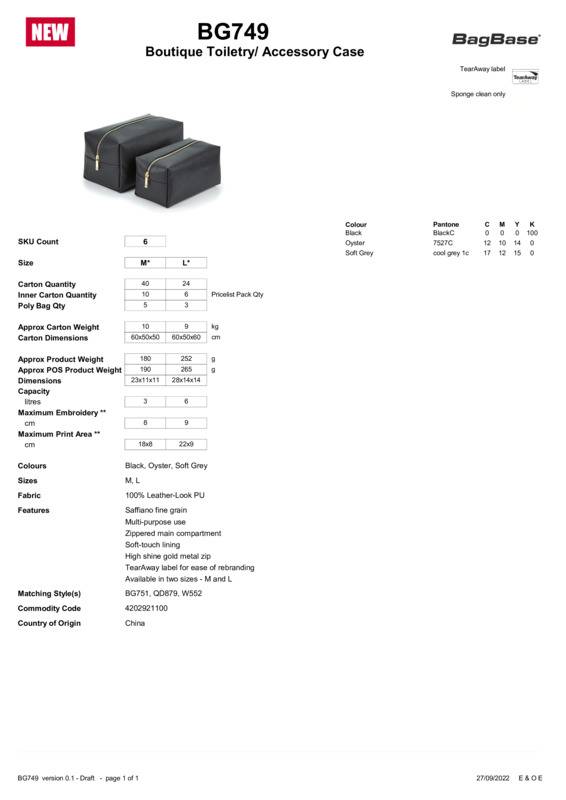 Every product in our Boutique collection combines soft, fine grain Saffiano fabric and high-shine hardware for a premium finish that elevates personalisation and gifting. BG749 introduces a boxy silhouette with generous capacity. A popular choice for bridesmaids and weddings, it’s the perfect way to carry essentials and memories.100% Leather-look PUSaffiano fine grainMultipurpose useZipped main compartmentSoft-touch liningHigh-shine gold metal zipTearAway label for easy rebranding.Age Group: AdultBag Capacity: M: 3 litres, L: 6 litresBag Dimensions: M: 23 x 11 x 11cm, L: 28 x 14 x 14cmFabric: 100% Leather-look PUGender: UnisexPlus Size: NoProduct Type: BagsSize Range: M, LSizing To Fit: M LTag: Tear-awayWashing Instructions: Sponge clean onlyWeight (GSM): M - 180g, L - 252g]]>