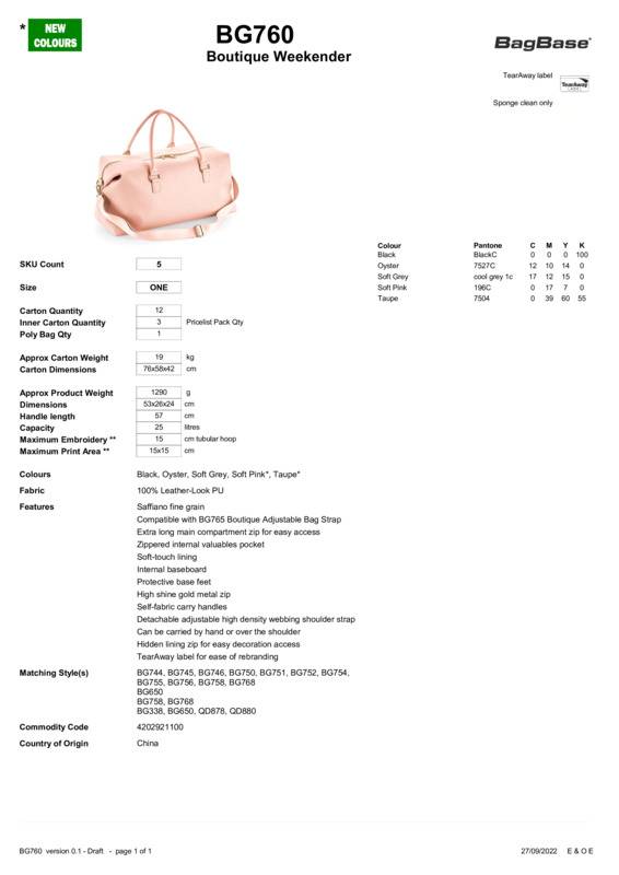 Made from 100% leather-look fine grain Saffiano fabric, the BG760 makes a luxurious statement. Not only is the design premium in quality, it’s also practical and multi-purpose with an extra-long main zippered compartment for easy access. Inside is a soft-touch lining, zippered valuables pocket and internal baseboard to maintain structure. A detachable and adjustable webbing shoulder strap is compatible with the BG765 Boutique Adjustable Bag Strap, for interchangeable styling. Protective base feet, high-shine, gold metal zip and self-fabric carry handles are additional finishing features.Saffiano fine grainExtra-long main compartment zip for easy accessZipped internal valuables pocketSoft-touch liningInternal baseboardProtective base feetHigh-shine gold metal zipSelf-fabric carry handlesCan be carried by hand or over the shoulderCompatible with BG765 Boutique adjustable bag strap, Detachable, adjustable high-density webbing shoulder strapTearAway label for ease of rebrandingBSCI certifiedReach certified.Accreditations: Amfori BSCI|ReachAge Group: AdultBag Capacity: 25 LitresBag Dimensions: 53 x 26 x 24cmEmbroidery Information: 15cm Tubular hoopFabric: 100% Leather-look PUGender: UnisexPlus Size: NoPrint Area: 15 x 15cmProduct Type: BagsSize Range: One sizeSizing To Fit: One sizeTag: Tear-awayWashing Instructions: Sponge clean onlyWeight (GSM): 1450g]]>