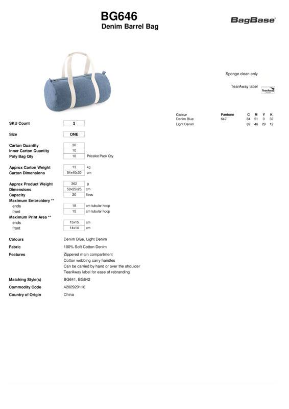 Carried by hand or over the shoulder, the denim barrel bag is a popular style contender. Available in a soft-touch denim blend, this relaxed barrel-shape bag makes the perfect gym kit holdall or weekend bag.TearAway label for ease of rebrandingZippered main compartmentCotton webbing carry handlesCan be carried by hand or over the shoulderBSCI certifiedReach certified.Accreditations: Amfori BSCI|ReachAge Group: AdultBag Capacity: 20 LitresBag Dimensions: 25 x 50 x 25cmEmbroidery Information: Ends: 18 Tubular hoop. Front: 15 Tubular hoopFabric: 100% Soft cotton denimGender: UnisexPlus Size: NoPrint Area: Ends: 15 x 15cm. Front: 14 x 14cmProduct Type: BagsSize Range: OnesizeSizing To Fit: One sizeTag: Tear-outWashing Instructions: Sponge clean only.Weight (GSM): 362g]]>