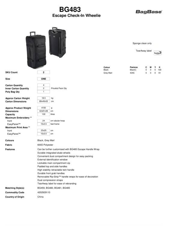TearAway label for ease of rebrandingConvenient dual compartment design for easy packingLockable main compartment zipExternal identification windowRemovable Rip-Strip™ handle wraps for ease of decorationDual compression strapsHigh stability retractable twin-handleDurable front grab handlesPadded top and side handlesDurable integrated skate wheelsCan be further customised with BG485 Escape handle wrapReach certifiedSEDEX certified.Accreditations: Sedex|ReachAge Group: AdultBag Capacity: 100 LitresBag Dimensions: 42 x 81 x 36cmEmbroidery Information: 24 Tubular hoop. EasyPanelâ„¢ (Fast frame) 15 x 3.5cmFabric: 600D PolyesterGender: UnisexPlus Size: NoPrint Area: Front: 25 x 25cm. EasyPanel™ (Fast frame) 15 x 3.5cmProduct Type: BagsSize Range: OnesizeSizing To Fit: One sizeTag: Tear-outWashing Instructions: Sponge clean onlyWeight (GSM): 4150g]]>