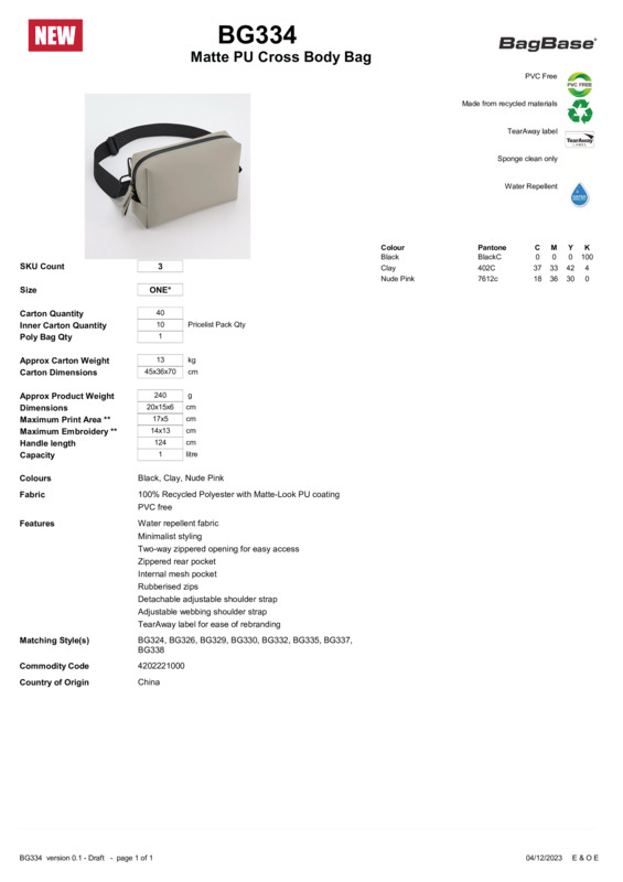 The Matte PU collection delivers multi-sensory appeal with its contemporary, tactile fabric that’s smooth to the touch and effortlessly cool in style. This cross-body bag has a multipurpose design, made with modern styling in mind. Wear over the shoulder, around the waist or with the strap removed as a versatile accessory case. A reversed PU zip adds to the clean, architectural design while a minimal, muted colour palette enhances gender-neutral appeal.Water-repellent fabricMinimalist stylingTwo-way zipped opening for easy accessZipped rear pocketInternal mesh pocketRubberised zipsDetachable, adjustable shoulder strapAdjustable webbing shoulder strapTearAway label for ease of rebrandingHandle length: 124cm.Age Group: AdultBag Capacity: 1 litreBag Dimensions: 20 x 15 x 6cmFabric: 100% Recycled polyester with matte-look PU coating. PVC-freeGender: UnisexPlus Size: NoProduct Type: BagsSize Range: One sizeSizing To Fit: One sizeTag: Tear-awayWashing Instructions: Sponge clean only.Weight (GSM): 240g]]>