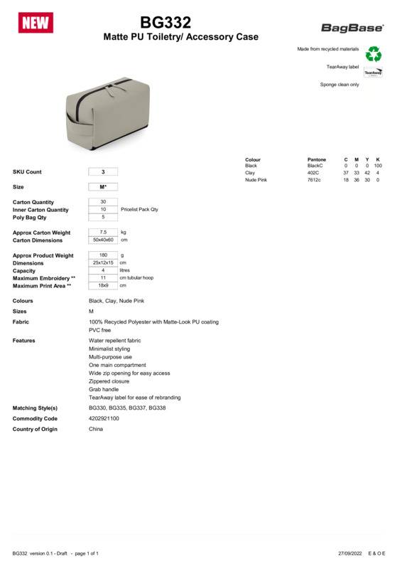 The Matte PU collection delivers multi-sensory appeal with its contemporary, tactile fabric that’s smooth to the touch and effortlessly cool in style. BG332 is a total travel essential, sized for anything from toiletries to tech accessories. A reversed PU zip adds to the clean, architectural design, while a minimal, muted colour palette enhances gender-neutral appeal.100% Recycled polyester with matte-look PU coatingPVC-freeWater-repellent fabricMinimalist stylingMultipurpose useOne main compartmentWide zip opening for easy accessZipped closureGrab handleTearAway label for easy rebranding.Age Group: AdultBag Capacity: 4 litresBag Dimensions: 25 x 12 x 15cmFabric: 100% Recycled polyester with matte-look PU coatingGender: UnisexPlus Size: NoProduct Type: BagsSize Range: One sizeSizing To Fit: One sizeTag: Tear-awayWashing Instructions: Sponge clean onlyWeight (GSM): 180g]]>