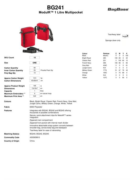 TearAway label for ease of rebrandingZippered main compartmentZippered front pocket with internal mesh dividerSecure, quick attachment clips for Modulr™ series integrationInnovative detachable strap system converts between shoulder bag, across body bag and waist packIntegrates with BG240, BG242 and BG245 offering thousands of possible combinationsReach certified.Accreditations: ReachAge Group: AdultBag Capacity: 1 LitresBag Dimensions: 13 x 19 x 7cmEmbroidery Information: 9 Tubular hoopFabric: 600D PolyesterGender: UnisexPlus Size: NoPrint Area: 9 x 9cmProduct Type: BagsSize Range: OnesizeSizing To Fit: One sizeTag: Tear-outWashing Instructions: Sponge clean onlyWeight (GSM): 195g]]>