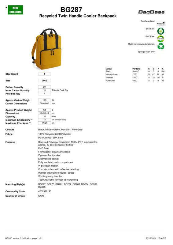Make way for the new wave of cool bag, abandoning convention in favour of casual, contemporary style. This 100% recycled polyester backpack provides the perfect laid-back look for trips outdoors, days at the park or adventures on foot. Its insulated main compartment keeps snacks chilled and is fully lined with a handy PEVA wipe-clean interior. Padded, adjustable straps keep comfort in check, while twin carry handles and a zippered front pocket break the mould for a modern cool bag design.PVC FreePEVA lining, BPA freeZippered front pocketFront pocket organiser sectionFully insulated main compartmentWipe clean interiorCord zip pullers with reflective detailingPadded adjustable shoulder strapsWebbing carry handlesTearAway label for ease of rebrandingReach certified.Accreditations: ReachAge Group: AdultBag Capacity: 16 LitresBag Dimensions: 50x40x70cmFabric: 100% Recycled 600D Polyester PEVA liningGender: UnisexPlus Size: NoPrint Area: 17 x 24cmProduct Type: BagsSize Range: OnesizeSizing To Fit: One sizeTag: Tear-outWashing Instructions: Sponge clean only.Weight (GSM): 425g]]>