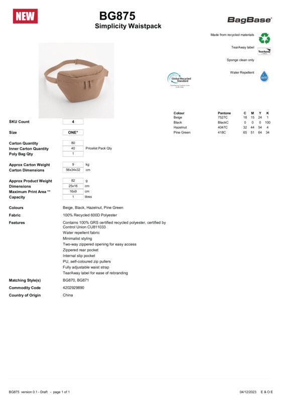Contains 100% GRS certified recycled polyester, certified by Control Union CU811033Water-repellent fabricMinimalist stylingTwo-way zipped opening for easy accessZipped rear pocketInternal slip pocketPU, self-coloured zip pullsFully adjustable waist strapTearAway label for ease of rebranding.Age Group: AdultBag Capacity: 1 litreBag Dimensions: 25 x 16cmFabric: 100% Recycled 600D polyesterGender: UnisexPlus Size: NoProduct Type: BagsSize Range: One sizeSizing To Fit: One sizeTag: Tear-awayWashing Instructions: Sponge clean only.Weight (GSM): 82g]]>