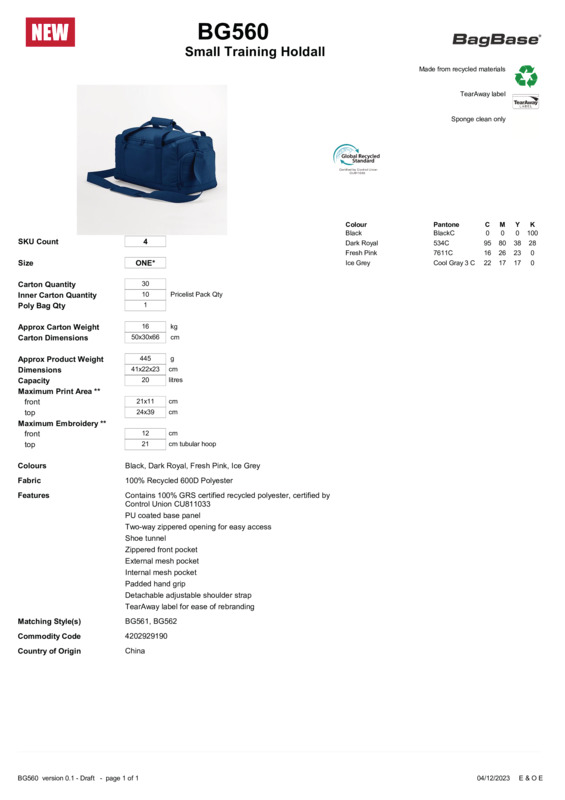 Store everything you need for your active, on-the-go life – from gym to swimming pool and everywhere in between. This stylish small training holdall provides ample capacity for all your most important essentials, with a padded hand grip to carry it all from A to B in comfort. You can even store your footwear securely within an integrated shoe tunnel. A timeless colour palette means you can match your active gear to your day-to-day wear for easy, effortless styling, whatever is on your schedule. Contains 100% GRS certified recycled polyester, certified by Control Union CU811033PU coated base panelTwo-way zipped opening for easy accessShoe tunnelZipped front pocketExternal mesh pocketInternal mesh pocketPadded hand gripDetachable, adjustable shoulder strapTearAway label for ease of rebranding.Age Group: AdultBag Capacity: 20 litresBag Dimensions: 41 x 22 x 23cmFabric: 100% Recycled 600D polyesterGender: UnisexPlus Size: NoProduct Type: BagsSize Range: One sizeSizing To Fit: One sizeTag: Tear-awayWashing Instructions: Sponge clean only.Weight (GSM): 445g]]>