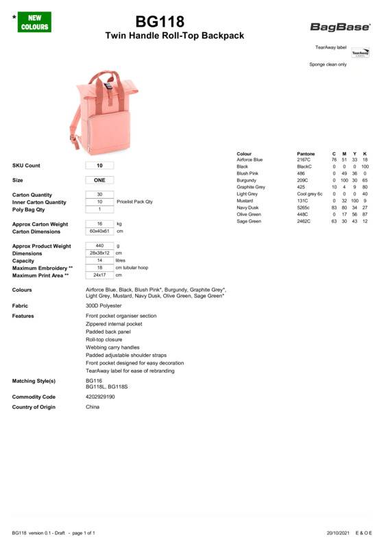 Discover a cool range of heritage colourways with the twin handle roll-top backpack. Featuring a dynamic roll-top design and square silhouette, retailers can easily add surface decoration to this vibrant fashion-led style.TearAway label for ease of rebrandingRoll-top closureFront pocket organiser sectionFront pocket designed for easy decorationWebbing carry handlesZippered internal pocketPadded back panelPadded adjustable shoulder strapsBSCI certifiedReach certified.Accreditations: Amfori BSCI|ReachAge Group: AdultBag Capacity: 14 LitresBag Dimensions: 28 x 38 x 12cmEmbroidery Information: 15 Tubular hoopFabric: 300D PolyesterGender: UnisexPlus Size: NoPrint Area: 24 x 17cmProduct Type: BagsSize Range: OnesizeSizing To Fit: One sizeTag: Tear-outWashing Instructions: Sponge clean only.Weight (GSM): 440g]]>