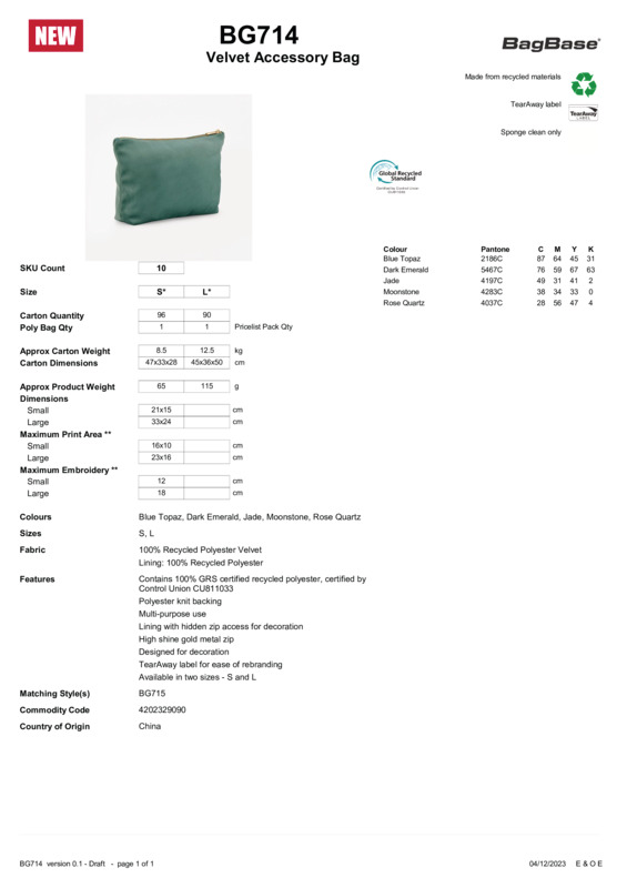 Soft velvet fabric instantly gives this accessory bag a luxurious look and feel to make it an ideal option for premium gifting and personal storage. This design is perfectly sized for accessories and other small essentials – make-up brushes, travel-size toiletries, etc. A palette of rich colours adds to this style’s luxe finish, complemented by high-shine gold hardware. Make it your own with elaborate decoration, such as intricate embroidery.Contains 100% GRS certified recycled polyester, certified by Control Union CU811033Polyester knit backingMultipurpose useLining with hidden zip access for decorationHigh-shine gold metal zipDesigned for decorationTearAway label for ease of rebrandingAvailable in two sizes: S and L.Accreditations: GOTSAge Group: AdultBag Dimensions: S - 21 x 15cm, L - 23 x 24cmFabric: 100% Recycled polyester velvet. Lining: 100% Recycled polyesterGender: UnisexPlus Size: NoProduct Type: BagsSize Range: S–LSizing To Fit: S LTag: Tear-awayWashing Instructions: Sponge clean only.Weight (GSM): S: 65g; L: 115g]]>