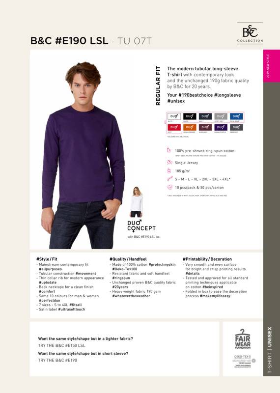 Contemporary fit with a thin collar for a modern appearance. Ringspun fabric for a soft hand feel and smooth and even surface for crisp printing results. Unchanged proven B&C quality fabric.100% ringspun cotton long sleeved t-shirtSingle Jersey, tubular construction with a thin rib and collar for a modern appearanceBack neck tape for a clean finish.Accreditations: Amfori BSCI|Fair Wear Foundation|BCI (Better cotton initiative)|Oeko-Tex|Peta Approved Vegan|ReachAge Group: AdultFabric: 100% Ringspun cottonGender: MalePlus Size: YesProduct Type: T-ShirtsSize Exclusions: *4XL only available in these coloursSize Range: S to 4XLSizing To Fit: S 36/38″ M 38/40″ L 41/42″ XL 43/44″ 2XL 46/48″ 3XL 52/54″ 4XL* 56/58″Tag: Sewn TagWashing Instructions: Machine wash 40°C. No bleach. Low dry temperature. Low iron-2. Do not dry clean.Weight (GSM): 190gsm]]>
