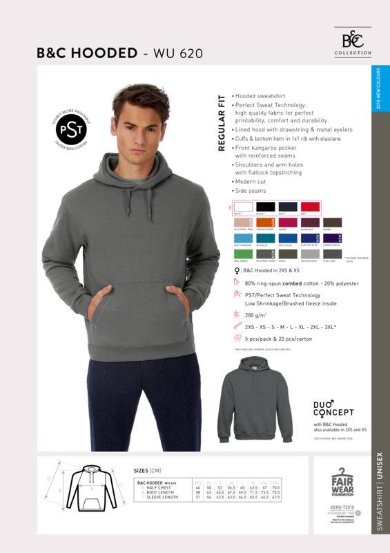 With our collection of sweatshirts and hoodies you’ll easily add an extra stylish layer to any outfit. The B&C Hooded sweatshirt offers comfort with large front pockets and hood. Featuring B&C’s Perfect Sweat Technology, the B&C Hooded sweatshirt is not just a fashion classic, it offers enhanced printability thanks to its unique fabric construction that offers the best print results. On top, it has a luxurious, soft handfeel and quality matt appearance, combined with durability and great comfort. With B&C PST unique fabric construction you can let your inspiration free, confident of great decoration results.B&C Perfect Sweat Technology - high quality fabric for perfect printability, comfort and durabilityLined hood with drawstring and eyeletsKangaroo pocket with reinforced seamsShoulders and armholes and bottom hemline with flatlock topstitchModern cut.Accreditations: Amfori BSCI|Fair Wear Foundation|BCI (Better cotton initiative)|Oeko-Tex|Peta Approved Vegan|ReachAge Group: AdultFabric: 80% Combed cotton, 20% Polyester. Low shrinkage. Brushed fleece inside.Gender: UnisexPlus Size: YesProduct Type: HoodiesSize Exclusions: *3XL only available in these coloursSize Range: XXS to 3XLSizing To Fit: XXS 28/32″ XS 32/36″ S 36/38″ M 38/40″ L 41/42″ XL 43/44″ 2XL 45/47″ 3XL* 47/49″Tag: Sewn TagWashing Instructions: Wash - 40. No - bleach. Dryer. Iron - 2. No - dry cleanWeight (GSM): 280gsm]]>