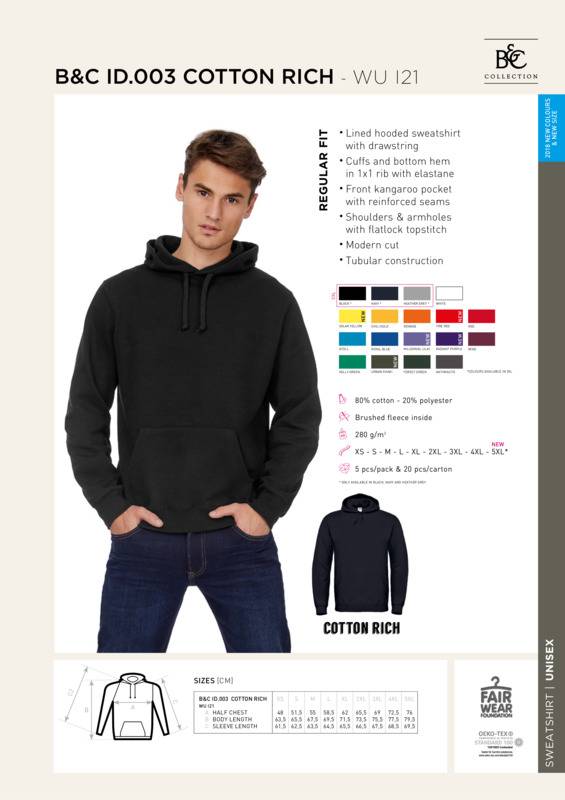 The cotton rich composition (80% cotton, 20% polyester) of the B&C ID.003 basic hoodie gives you the efficient blend of decoration result and wearer comfort. Featuring a modern cut, a lined hood and brushed fleece inner, this mainstream classic is at home for work or leisure.Lined hooded sweatshirt with drawstringCuffs and bottom hem in 1x1 rib with elastaneFront kangaroo pocket with reinforced seamsTopstitching flatlock on shoulders, arm holes and bottom hemlineModern cutTubular construction.Accreditations: Amfori BSCI|Fair Wear Foundation|BCI (Better cotton initiative)|Oeko-Tex|Peta Approved Vegan|ReachAge Group: AdultFabric: 80% Cotton, 20% Polyester. Brushed fleece insideGender: UnisexPlus Size: YesProduct Type: HoodiesSize Exclusions: *5XL only available in these coloursSize Range: XS to 5XLSizing To Fit: XS 34/36″ S 36/38″ M 38/40″ L 41/42″ XL 43/44″ 2XL 45/47″ 3XL 47/49″ 4XL 49/51″ 5XL* 51/53″Tag: Sewn TagWashing Instructions: Wash - 40. No - bleach. Dryer. Iron - 2. No - dry cleanWeight (GSM): 280gsm]]>