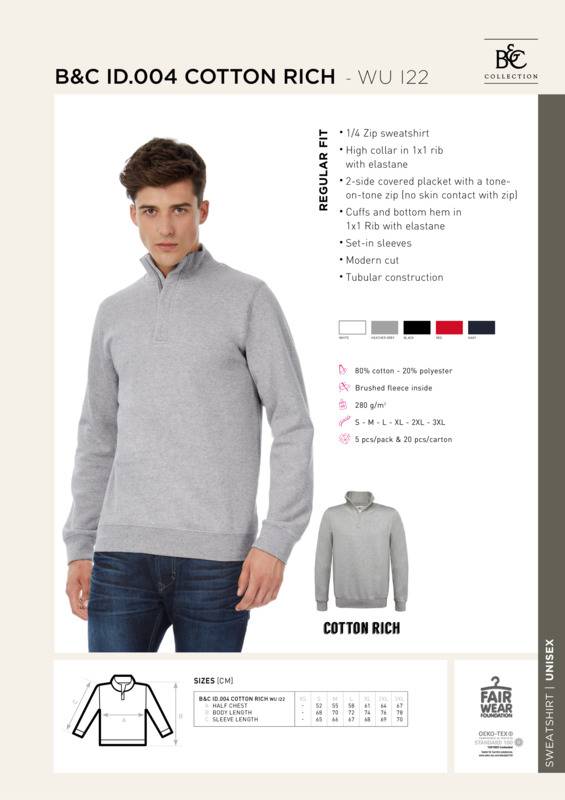 The cotton rich composition (80% cotton, 20% polyester) of the B&C ID.004 basic sweatshirt gives you the efficient blend of decoration result and wearer comfort. Featuring a 1/4 zip on its high 1x1 rib collar and a 2-side covered placket to avoid skin contact with zip.1/4 zip sweatshirtCuffs and bottom hem in 1x1 rib with ElastaneHigh collar in 1x1 rib with ElastaneCovered placket with a tone-on-tone zip (no skin contact with zip)Set-in-sleevesModern cutTubular construction.Accreditations: Amfori BSCI|Fair Wear Foundation|BCI (Better cotton initiative)|Oeko-Tex|Peta Approved Vegan|ReachAge Group: AdultFabric: 80% Cotton, 20% Polyester. Brushed fleece insideGender: UnisexPlus Size: YesProduct Type: SweatshirtsSize Range: S to 3XLSizing To Fit: S 36/38″ M 38/40″ L 41/42″ XL 43/44″ 2XL 45/47″ 3XL 47/49″Tag: Sewn TagWashing Instructions: Wash - 40. No - bleach. Dryer. Iron - 2. No - dry cleanWeight (GSM): 280gsm]]>