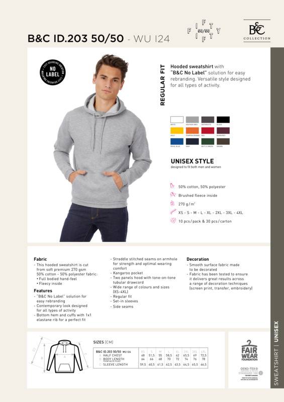 Hooded sweatshirt with B&C No Label solution for easy rebranding. Versatile style designed for all types of activity.This hooded sweatshirt features a soft premium 50% cotton - 50% polyester fabric with ″B&C No Label″ solution for easy rebrandingThe regular fit assures the perfect balance of long-lasting comfort and a contemporary silhouetteAvailable in a wide range of colours and sizes at the best price/value propositionUnisex style: designed to fit both men and women.Fabric - This hooded sweatshirt is cut from soft premium 270 gsm 50% cotton - 50% polyester fabric.- Full bodied hand-fee - Fleecy insideFeatures: ″B&C No Label″ solution for easy rebrandingContemporary look designed for all types off activity.Bottom hem and cuffs with 1x1 elastane rib for a perfect fitStraddle stitched seams on armhole for strength and optimal wearing comfortKangaroo pocketTwo panels hood with tone-on-tone tubular drawcordWide range of colours and sizes (XS-4XL)Regular fitSet-in sleevesSide seamsDecoration; Smooth surface fabric made to be decoratedFabric has been tested to ensure it delivers great results across a range of decoration techniques (screen print, transfer, embroidery).Accreditations: Amfori BSCI|Fair Wear Foundation|BCI (Better cotton initiative)|Oeko-Tex|Peta Approved Vegan|ReachAge Group: AdultFabric: 50% Cotton, 50% Polyester, brushed fleece insideGender: MalePlus Size: YesProduct Type: HoodiesSize Range: XS to 4XLSizing To Fit: XS 34/36″ S 36/38″ M 38/40″ L 41/42″ XL 43/44″ 2XL 45/47″ 3XL 47/49″ 4XL 49/51″Tag: TaglessWashing Instructions: 40 degree wash. Do not bleach. Tumble dry low heat setting. Warm iron. Do not dry clean or remove stains with solvents.Weight (GSM): 270gsm]]>
