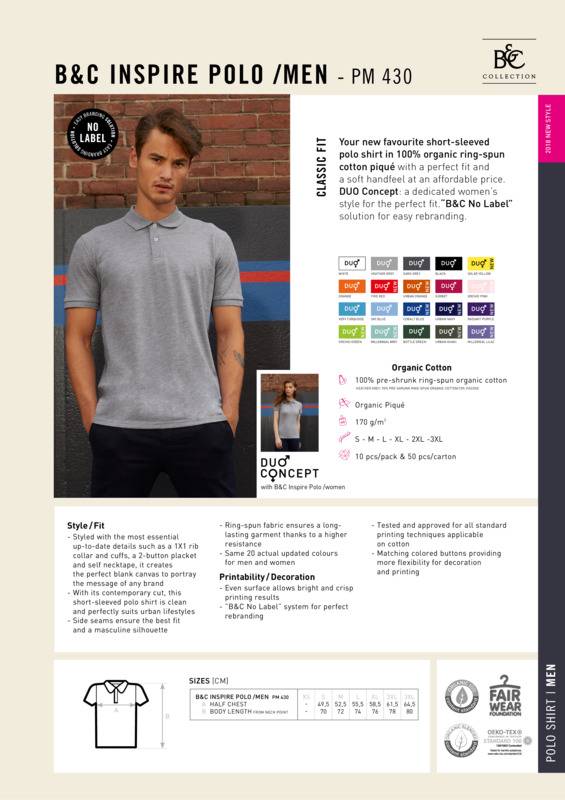 Your new favourite short sleeved polo shirt in 100% organic ringspun cotton piqué with a perfect fit and a soft hand feel at an affordable price. “B&C No Label” solution for easy rebranding.Style/Fit - Styled with the most essential up-to-date details such as a 1x1 rib collar and cuffs, a 2-button placket and self necktape, it creates the perfect blank canvas to portray the message of any brandWith its contemporary cut, this short sleeved polo shirt is clean and perfectly suits urban lifestylesSide seams ensure the best fit and a masculine silhouetteRingspun fabric ensures a long lasting garment thanks to a higher resistancePrintability/Decoration - Even surface allows bright and crisp printing results”B&C No Label” system for perfect rebrandingTested and approved for all standard printing techniques applicable on cottonMatching coloured buttons providing more flexibility for decoration and printing.Accreditations: Amfori BSCI|Fair Wear Foundation|Organic 100 Content Standard|Oeko-Tex|Peta Approved Vegan|ReachAge Group: AdultFabric: 100% Pre-shrunk ringspun Organic or Organic In Conversion cottonGender: MalePlus Size: NoProduct Type: PolosSize Range: S to 3XLSizing To Fit: S 36/38″ M 38/40″ L 41/42″ XL 43/44″ 2XL 45/47″ 3XL 49/51″Tag: TaglessWashing Instructions: Wash-40, no-bleach, dryer, iron-2, no-dry clean.Weight (GSM): 170gsm]]>