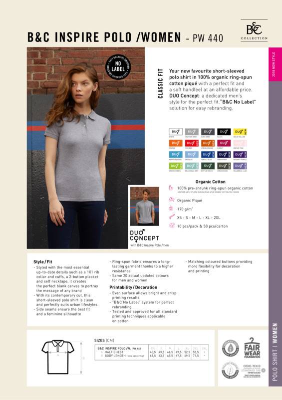 Your new favourite short sleeved polo shirt in 100% organic ringspun cotton piqué with a perfect fit and a soft hand feel at an affordable price. DUO Concept: a dedicated men’s style for the perfect fit.“B&C No Label” solution for easy rebranding.Style/Fit - Styled with the most essential up-to-date details such as a 1X1 rib collar and cuffs, a 2-button placket and self necktape, it creates the perfect blank canvas to portray the message of any brandWith its contemporary cut, this short sleeved polo shirt is clean and perfectly suits urban lifestylesSide seams ensure the best fit and a feminine silhouetteringspun fabric ensures a long lasting garment thanks to a higher resistanceSame 20 actual updated colours for men and womenPrintability/Decoration - Even surface allows bright and crisp printing results”B&C No Label” system for perfect rebrandingTested and approved for all standard printing techniques applicable on cottonMatching coloured buttons providing more flexibility for decoration and printing.Accreditations: Amfori BSCI|Fair Wear Foundation|Organic 100 Content Standard|Oeko-Tex|Peta Approved Vegan|ReachAge Group: AdultFabric: 100% Pre-shrunk ringspun Organic or Organic In Conversion cottonGender: FemalePlus Size: NoProduct Type: PolosSize Range: XS to 2XLSizing To Fit: XS 8 S 10 M 12 L 14 XL 16 2XL 18Tag: TaglessWashing Instructions: Wash-40, no-bleach, dryer, iron-2, no-dry clean.Weight (GSM): 170gsm]]>